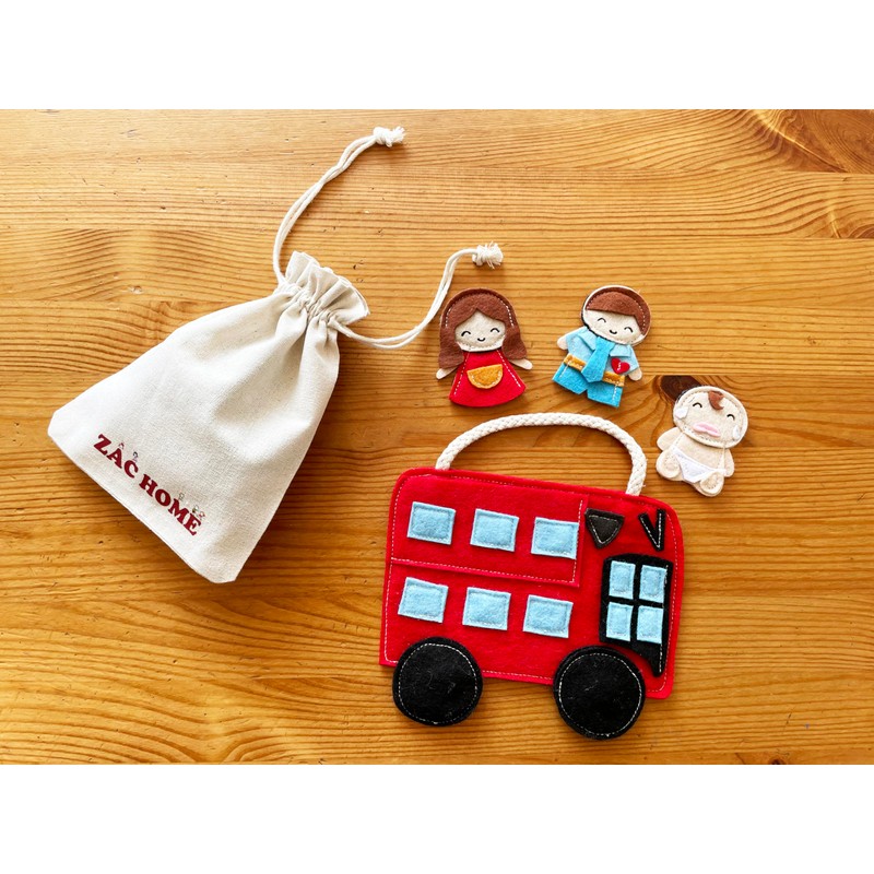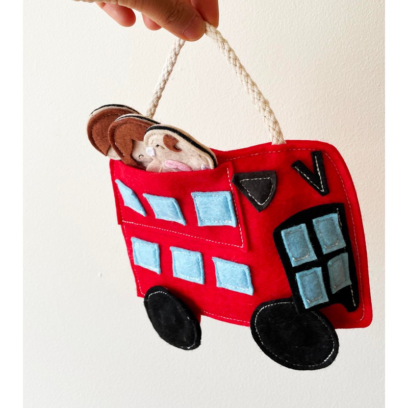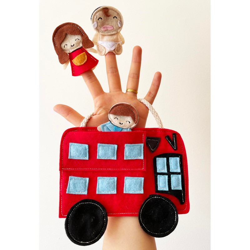 Nursery Rhyme" The Wheels on the Bus " Finger Puppet Play Set - Detachable Wheels, Open-and-Shut Door, 3 Finger Puppets Mummy Dadday and Baby with a Bus Bag