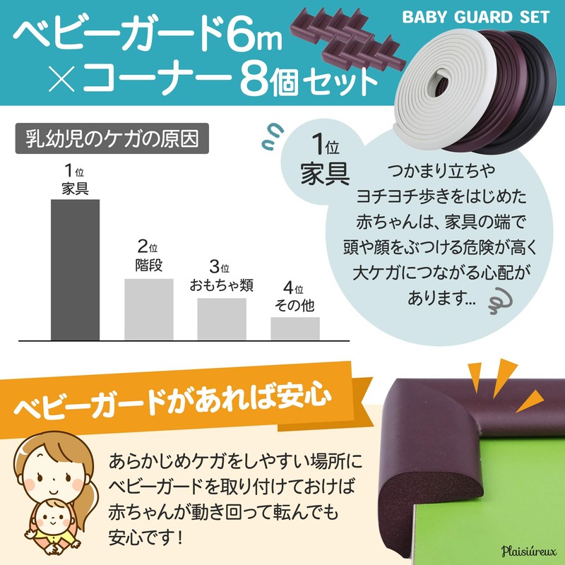 • Baby Guard Set of 8 Corners (23.6 ft (6 m) & 8 Pieces) Babies who have been grabbing and walking around the end of the furniture, and there is a risk of injury to the head. Put the baby guard in a place that is prone to injuries beforehand, so you can rest assured that your baby will move around and fall around. Available in 3 colors: white, brown and black