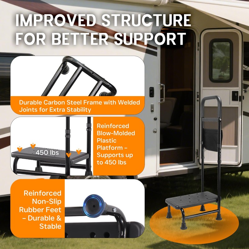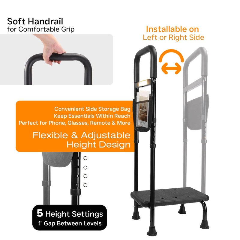- 【Adjustable Handrail with Comfortable Grip】The handrail features 5 adjustable height settings (37.8″–42.2″). The soft padded grip provides comfortable and secure support and can be installed on either the left or right side to accommodate different user preferences and space requirements.