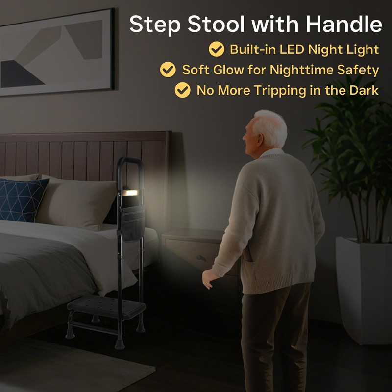 NurturaNook Step Stool with Handle – One Step Foot Stool for Adults, Non-Skid Bed Steps for High Beds, Adjustable Handrail with Night Light & Storage Bag, Safe Step Stool for Seniors & Elderly