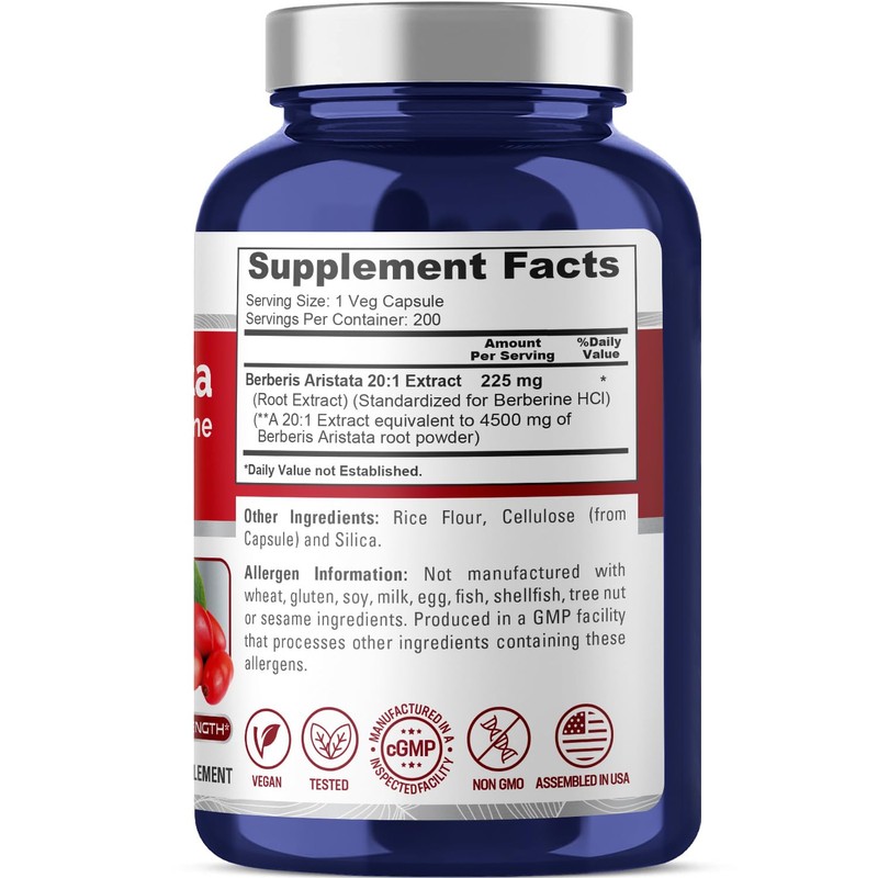 Extra strength Berberis Aristata. With Extract at 20:1 potency, one capsule provides the equivalence of 4,500 mg of Berberis Aristata root powder Extra strength Berberis Aristata. With Extract at 20:1 potency, one capsule provides the equivalence of 4,500 mg of Berberis Aristata root powder 200 veggie caps for a 200 Day supply 200 veggie caps for a 200 Day supply 100% Vegetarian/Vegan,Non-GMO & Gluten Free 100% Vegetarian/Vegan,Non-GMO & Gluten Free Manufactured in the USA in a laboratory that complies with strict GMP rules. Manufactured in the USA in a laboratory that complies with strict GMP rules. Berberis Aristata root extract standardized for Berberis HCL Berberis Aristata root extract standardized for Berberis HCL
