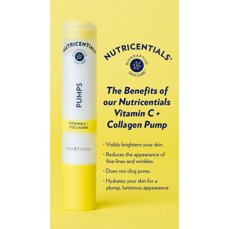 Brighten and smooth your complexion with our Nutricentials Vitamin C + Collagen Pump. This powerful pump hydrates and brightens your skin, helping it adapt to its unique and ever-changing environment. Furthermore, our headline ingredients, Vitamin C and Collagen, work together to reduce the early onset of skin aging by visibly minimizing the appearance of fine lines and wrinkles.