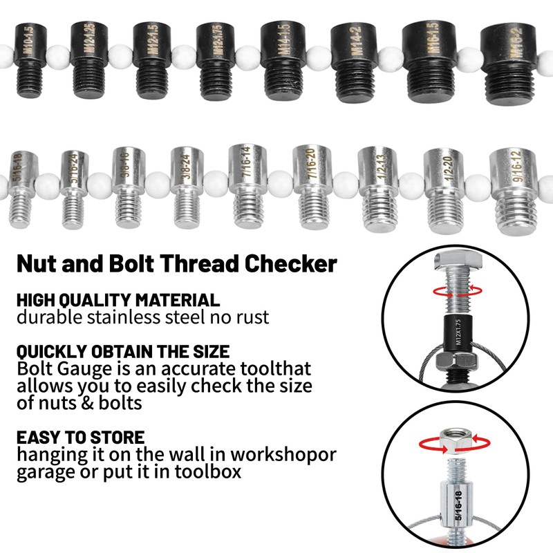 - 【High-Quality Stainless Steel Material】Nut and bolt thread checker is made of high-quality stainless steel, with excellent rust resistance, high hardness and wear resistance, not easy to wear and break, more durable than aluminum thread checker; Each bolt size and thread gauge is clearly labeled with the thread size and can be rotated freely around the wire cable for legibility. The standard and metric thread gauge tool also features a hanging storage design, making it convenient to hang on a pegboard or tool rack.