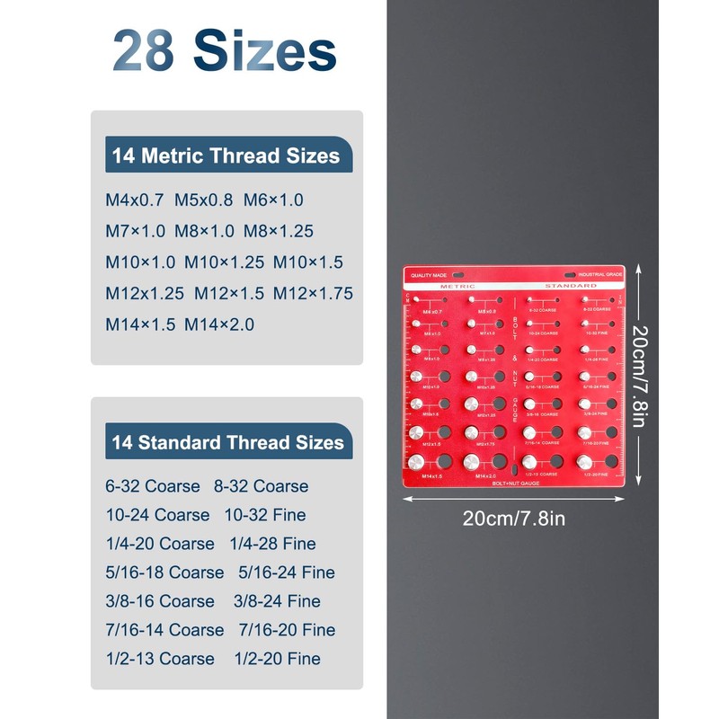 Nut and Bolt Thread Checker, Bolt Identifier Board, Bolt and Nut Identifier Gauge, Screw Bolt Size and Thread Gauge, Thread Checker with 14 Standard and 14 Metric