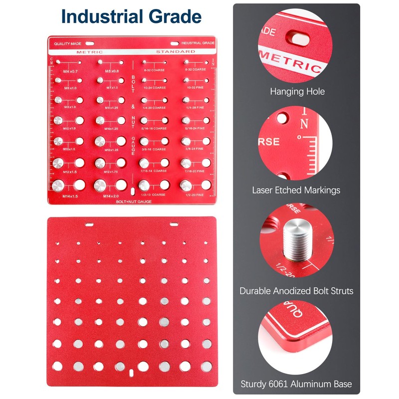 - 【Smooth to Touch】Nuts & bolts thread checker's manufactured from heavy aluminum base that's been red anodized, stainless steel crews.
