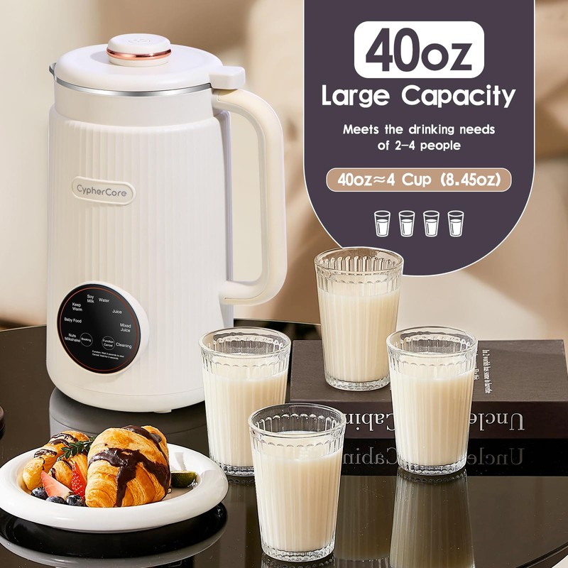 - 【40oz Large Capacity】The soy milk maker machine has a large capacity design that allows you to make drinks for the whole family at once, perfect for breakfast enjoyment. It does not make too much noise when in use, and the non-slip base design can effectively prevent shaking and sliding during use.