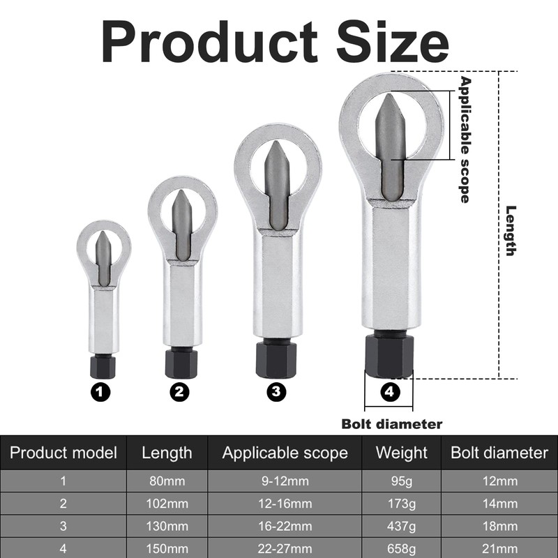 • COMPLETE SPECIFICATIONS Nut splitter bolt diameter 12mm (#1), 14mm (#2), 18mm (#3), 21mm (#4). Suitable for removing nuts: 9 ~ 12 mm (#1), 12 ~ 16 mm (#2), 16 ~ 22 mm (#3), 22 ~ 27 mm (#4).
