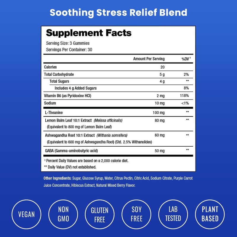 • Clinically Studied Calming Ingredients - Ashwagandha Root Extract, Lemon Balm Extract, Vitamin B6, GABA & L-Theanine gummies. Our stress relief supplement is packed with relaxing ingredients that have been clinically shown to calm and clear the mind.