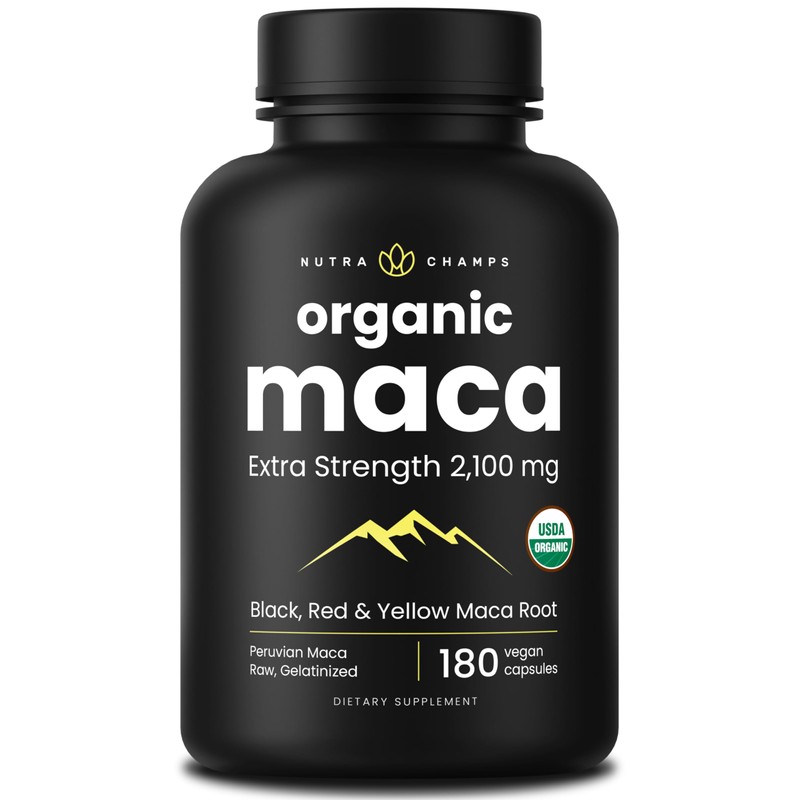NutraChamps USDA Organic Maca Root Capsules for Women & Men, 2100mg, 180 Capsules, Black, Red & Yellow, Peruvian Maca Peruana, Extra Strength Pure Premium Gelatinized Root Powder Supplement