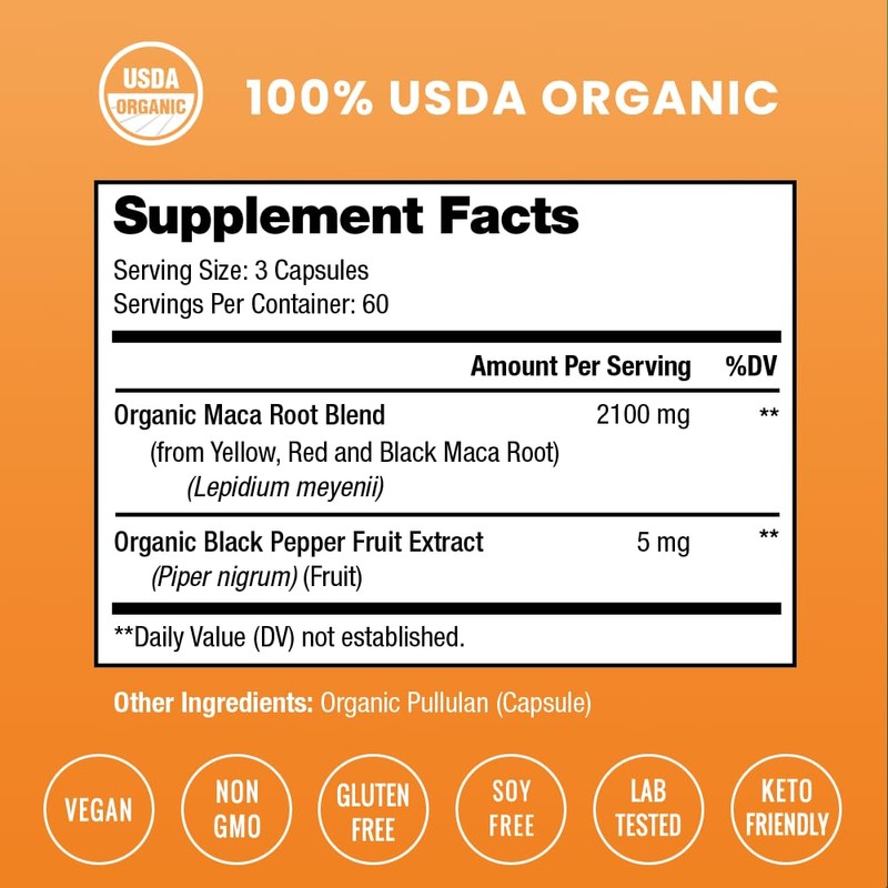 - 100% USDA Certified Organic, Highest Quality Guaranteed - We work with organic farmers in the Peruvian Andes mountains to deliver you one of the most effective maca root supplement available today. Lab-tested, non-GMO, vegan, and made in the USA.