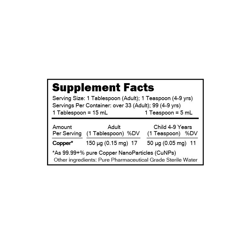 DIRECTIONS: MediCOPPER® Blood Booster is non-toxic and perfectly safe to consume daily in perpetuity as a dietary Copper nutritional supplement. Taking MediCOPPER as directed provides 17% of the adult RDA for Copper, but the RDA is a minimum and your adult body may require more - so do your own research. Each adult serving (1 Tbsp / 15 mL) provides 150 µg (0.15 mg) which is 17% of the adult RDA for dietary Copper. For 100% of the adult RDA for dietary Copper, see MediCOPPER® Plus (aka MediCOPPER+) Blood Booster which provides 900 µg (0.9 mg) which is 100% of the adult RDA for dietary Copper. Each child (4+ yrs) serving (1 Tsp / 5 mL) provides 50 µg (0.05 mg) of dietary Copper. MediCOPPER should be taken on an empty stomach to maximize absorption in the gastro-intestinal tract. Wait 20 minutes before eating or drinking. Unopened, sealed bottles of MediCOPPER have a proven shelf life of 12+ years. Once received, just store MediCOPPER at room temperature out of direct sunlight.