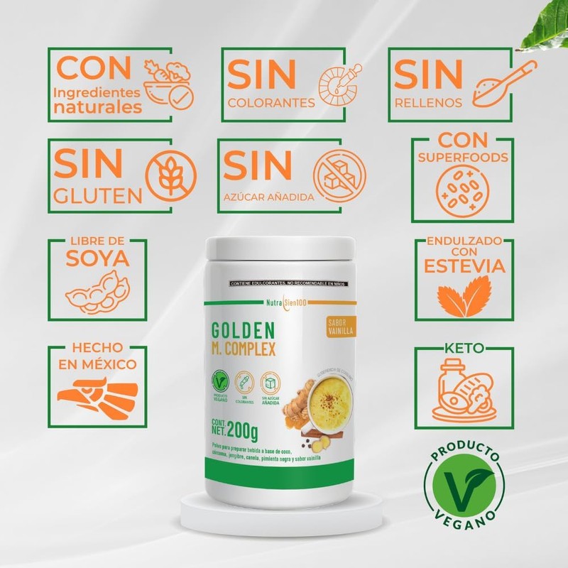 Título: Nutrasien100 | Golden M. Complex - Golden Milk Vegano Sin Azúcar | Sabor Vainilla con Base de Coco | 200g para 25 Porciones | Ideal para Relajación y Bienestar Nocturno