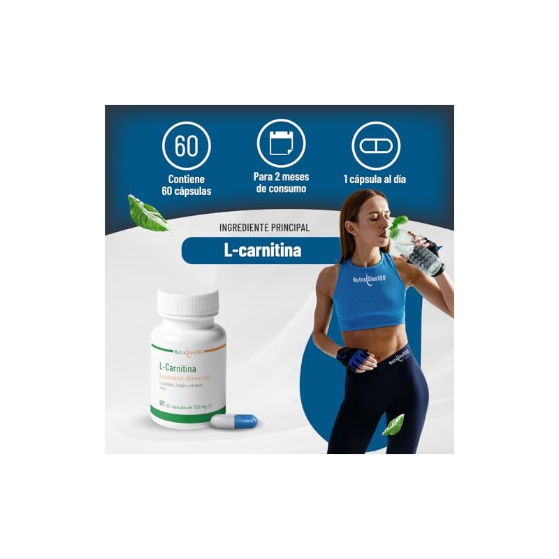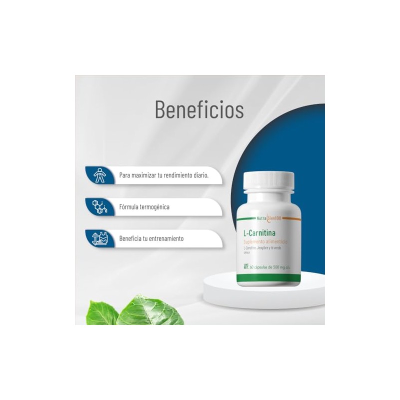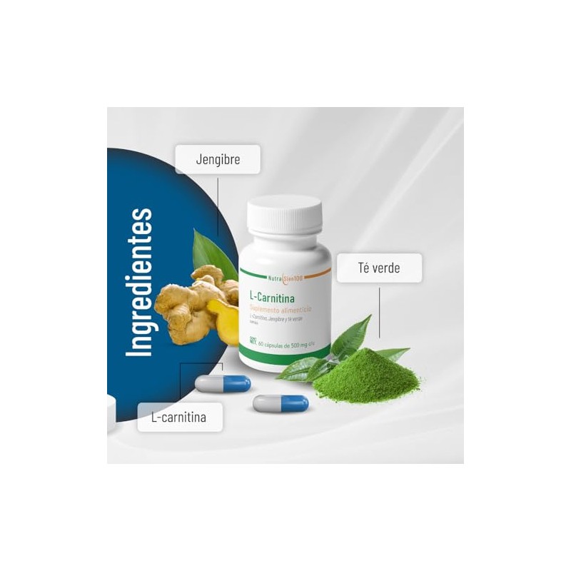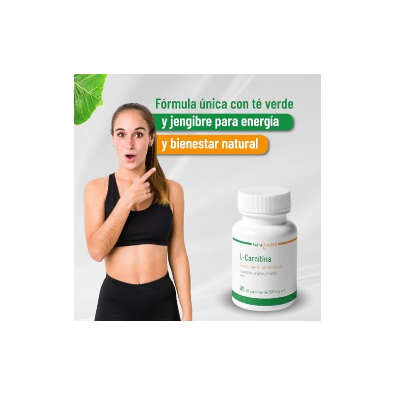 Nutrasien100 L-Carnitina 500 mg Con T Verde y Jengibre Energa y Apoyo Metablico Suplemento Termognico Pre-entreno 60 Cpsulas