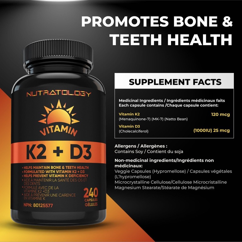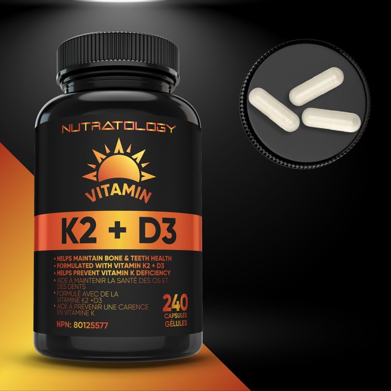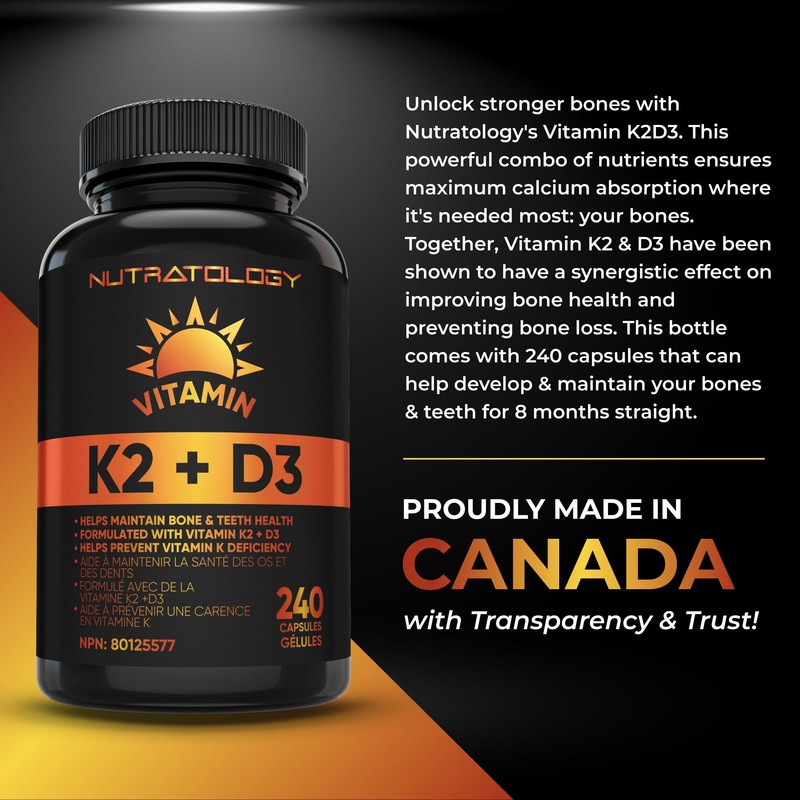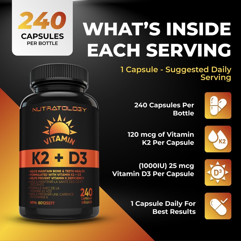 Nutratology Nutratology Vitamin K2 + D3 Highest Potency 120MCG/1000 IU - 240 Capsules - Helps Maintain Bone & Teeth Health - Formulated With MK-7 For Best Results - Immune System Support - Made In Canada