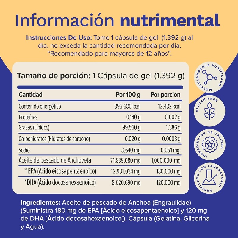 - Alta absorción - Respalde su bienestar sin molestias digestivas y sin mal aliento, conteniendo la dosis adecuada de DHA y EPA, los beneficios mejorados de nuestras cápsulas fáciles de ingerir, para una máxima absorción y comodidad.