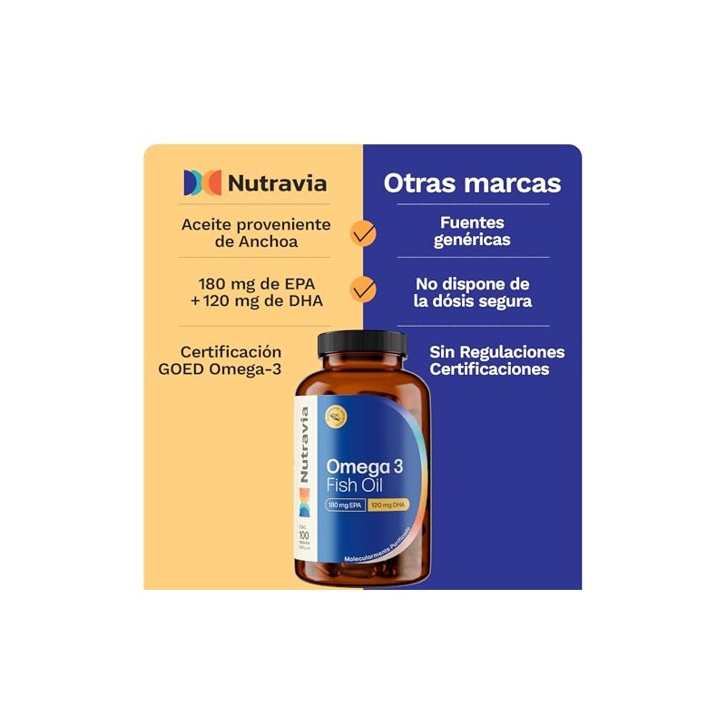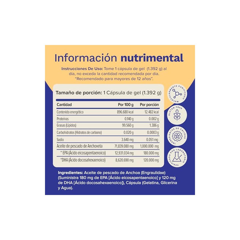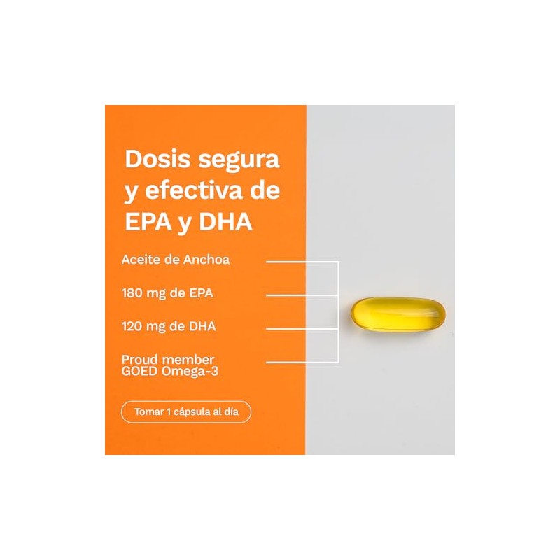 - Obtenga una fuente natural de ácidos grasos Omega 3 con solo una pequeña cápsula diaria que proporciona 1000 mg de aceite de pescado de Anchoa, 180 mg de EPA y 120 mg de DHA, conocidas por su bajo riesgo de bioacumulación de contaminantes. Alta absorción