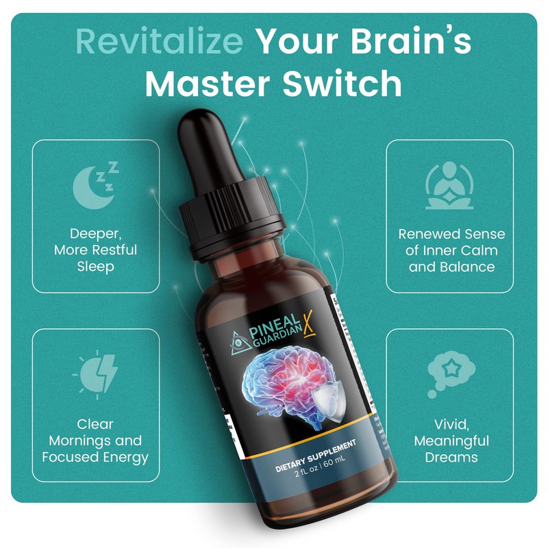 Introducing Pineal Guardian X, the revolutionary mental focus supplement designed to cleanse and rejuvenate your pineal gland. This breakthrough brain focus formula is engineered to rapidly dissolve calcified buildup accumulated over time. As a focus supplement, Pineal Guardian X serves as a comprehensive brain function supplement that lays the foundation for lifelong cognitive abilities. By flushing away fluoride build up in your pineal gland,, our expertly crafted brain support supplement helps decalcify and restore your pineal gland function, — the part of your brain that regulates melatonin and helps create new, healthy neurons and brain cells. All of this leads to enhanced mental clarity, memory, sleep, and focus. If you're looking for brain supplements for memory and focus, you will feel the shift with Pineal Guardian X focus drops. This brain function supplement banishes mental fog, improves sleep quality, and strengthens emotional resilience. Developed by Nutraville, Pineal Guardian X mental focus supplement wants you to embrace a more vibrant, spiritually enriched, and fulfilling life.