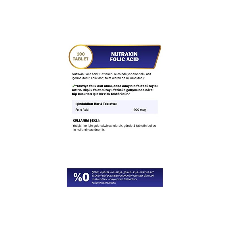 • Nutraxin Folic Acid; B vitamini ailesinde yer alan folik asit içermektedir. Folik asit, folat olarak da bilinmektedir.