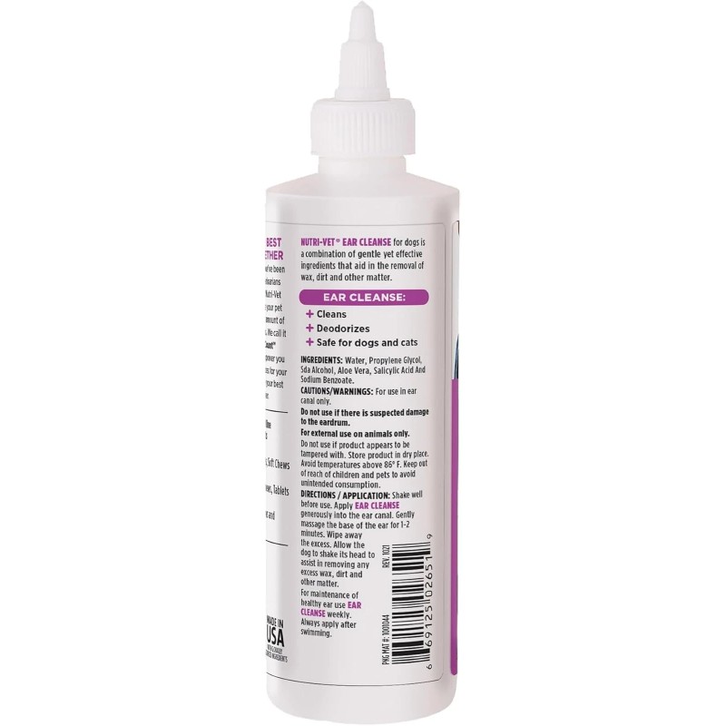 Nutri-Vet Ear Cleanse for Dogs is a veterinarian-formulated ear cleaner designed to support your dog's ear hygiene routine. This gentle yet effective dog ear cleaning solution removes wax, dirt, and debris, helping to maintain fresh and healthy ears. Regular use of this ear wash for dogs may aid in preventing ear infection in dogs and provide relief for itchy, irritated ears. Ideal for ear cleaning for dogs of all breeds and sizes, this ear cleaner for dogs is easy to apply—simply use it as an ear flush for dogs by applying the solution to the ear canal, massaging the base of the ear, and wiping away excess with a soft cloth. Perfect for dog ear infection treatment or as a dog ear drops for infection prevention, this versatile ear cleaner dog solution works for routine maintenance or targeted ear treatment. Whether you need ear drops for dogs' ear infections, a dog ear wash, or dog ear treatment for infections, Nutri-Vet Ear Cleanse is the trusted choice. Keep your pet’s ears fresh, clean, and odor-free with this effective ear cleaner for dogs.