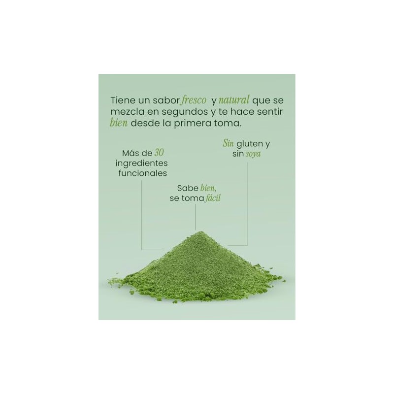 - ✅ Sabor fresco y natural: Se mezcla fácilmente en segundos. Disfruta de un sabor agradable desde la primera toma, sin el típico sabor amargo de otros verdes.