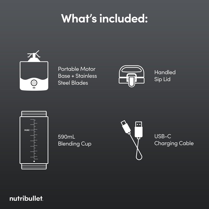 - Package Includes You will get a portable motor base with stainless steel blades, a 20oz mixing cup, a drinking lid with handle, and a USB-C charging cable.