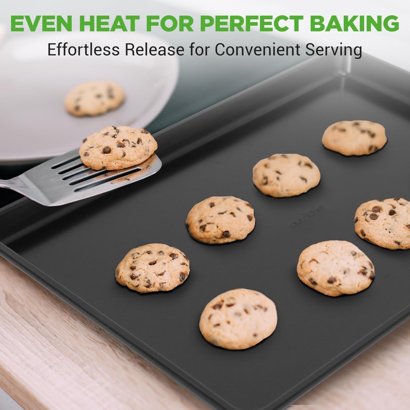 - FOOD SAFE AND EASY TO CLEAN – This baking pan is PFOA, PFOS, and PTFE-free, ensuring safe, worry-free baking every time. Designed for convenience, this durable cookie sheet is dishwasher safe, making cleanup effortless after every use.