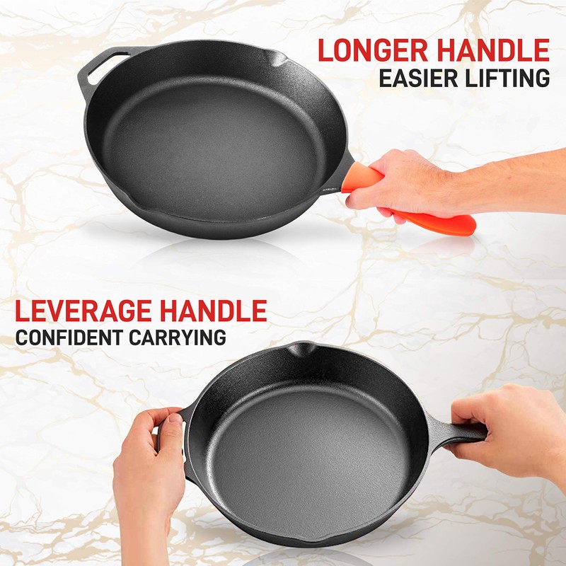 - HEAT SAFE UP TO 500° F: The nonstick skillet cast iron pan is heat-safe at high temperatures up to 500°F (200° Celsius). Features wide diameter size for large meals & includes cool touch orange silicone handles & glass lid cover