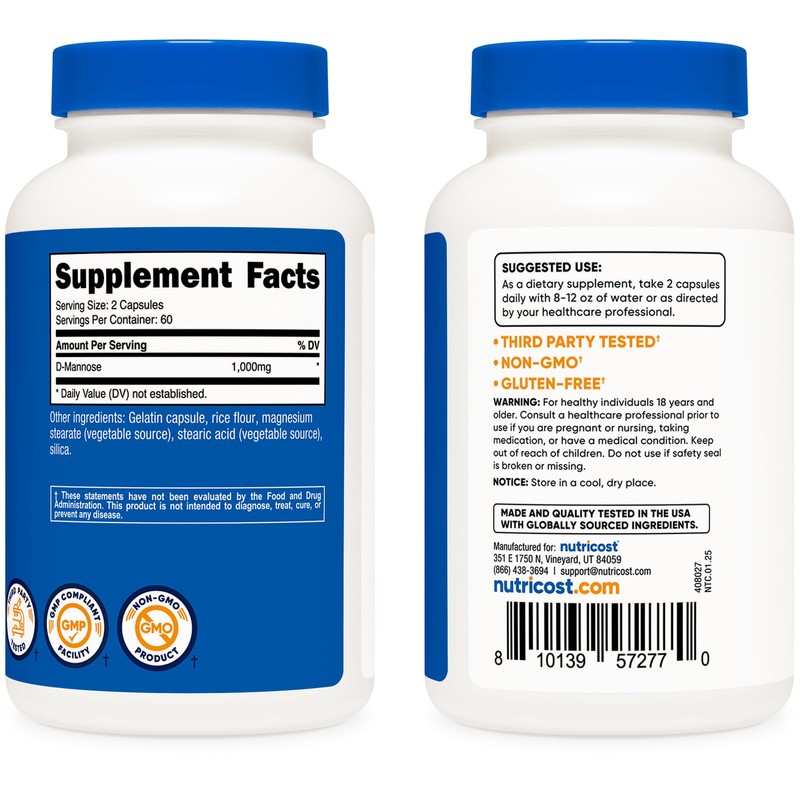 Nutricost D-Mannose 1000mg Per Serving, 120 Capsules - 500mg Per Capsule, Urinary Tract Health, Non-GMO and Gluten Free