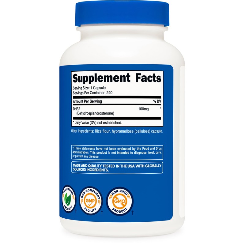 Each bottle of Nutricost DHEA contains 240 Capsules. Each capsules contains 100mg of high quality DHEA. They are non-gmo, gluten free, soy free, quick release, high quality DHEA capsules. All Nutricost products undergo tested by independent (3rd party), ISO-accredited laboratories and are manufactured in a GMP compliant, FDA registered facility.