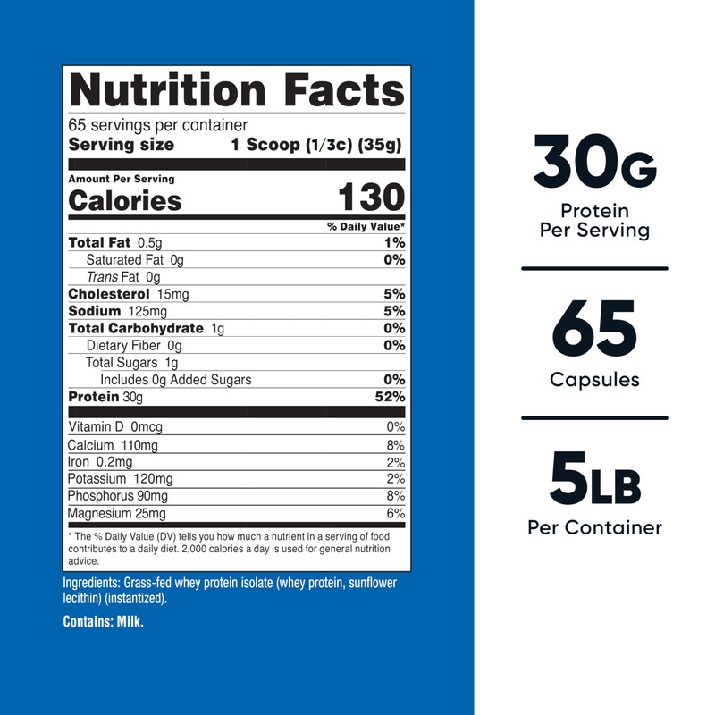 - 5LBS of Undenatured Grass-Fed Whey Protein Isolate Per Bottle