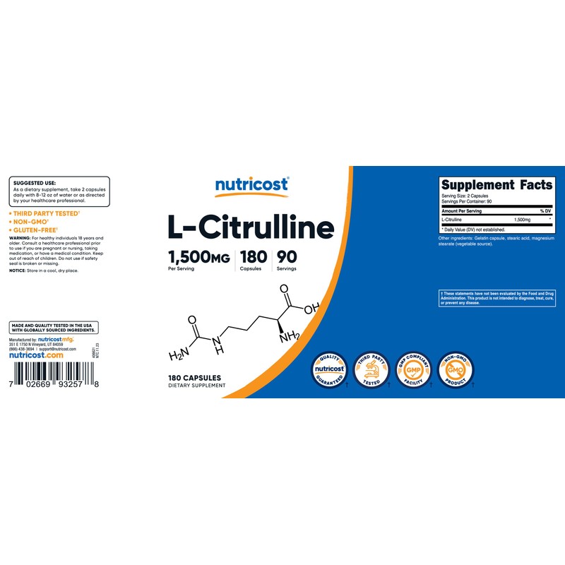 Nutricost Nutricost L-Citrulline 1500mg, 180 Capsules - 750mg Per Capsule, Gluten Free, Non-GMO, Packaging May Vary