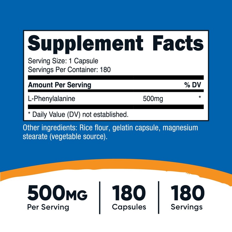 L-Phenylalanine is an essential amino acid. Nutricost's L-Phenylalanine contains 180 capsules of L-Phenylalanine for 180 servings. Each serving is just one capsule containing 500mg of L-Phenylalanine. Nutricost, located and headquartered in the USA, only uses the best ingredients to ensure maximum quality and to help you feel your best! By keeping our supplement recipes simple and clean, you get the best experience possible with Nutricost. Our supplements are manufactured in a GMP-compliant and FDA-registered facility; and each batch of every product is tested by independent, ISO-accredited laboratories.