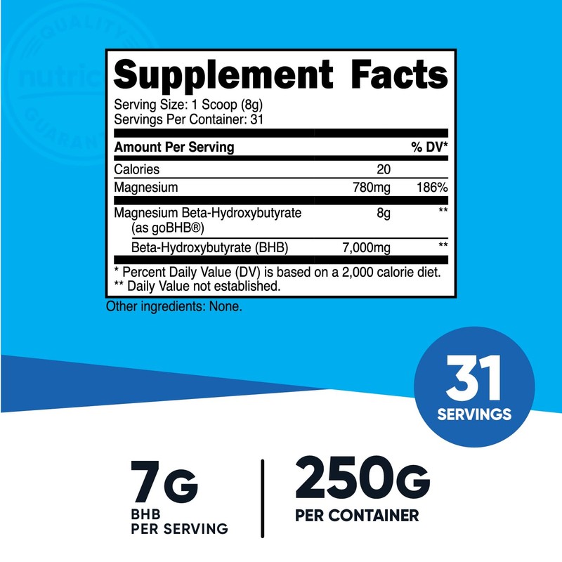 Nutricost Magnesium Ketone Salt contains 6.5g of Beta-Hydroxybutyrate (BHB) per serving. We recommend taking 2 servings a day during the fat/keto-adaptation period. Once ketosis is established, continue take 2 servings per day as needed.