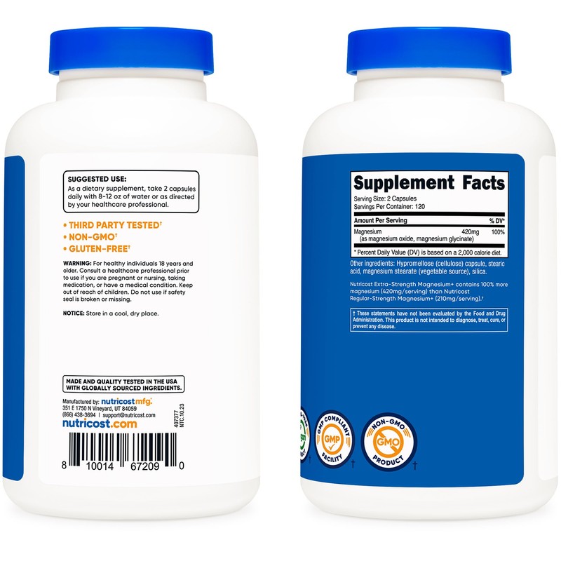 Nutricost Magnesium+ contains 420 milligrams of magnesium (from magnesium oxide and magnesium glycinate) in every serving. 240 capsules for 120 Servings per bottle. Nutricost, located and headquartered in the USA, only uses the best ingredients for maximum quality and to help you feel your best! By keeping our supplement recipes simple and clean, you get the best experience possible with Nutricost. Our supplements are manufactured in a GMP-compliant and FDA-registered facility; and each batch of every product is tested by independent, ISO-accredited laboratories.