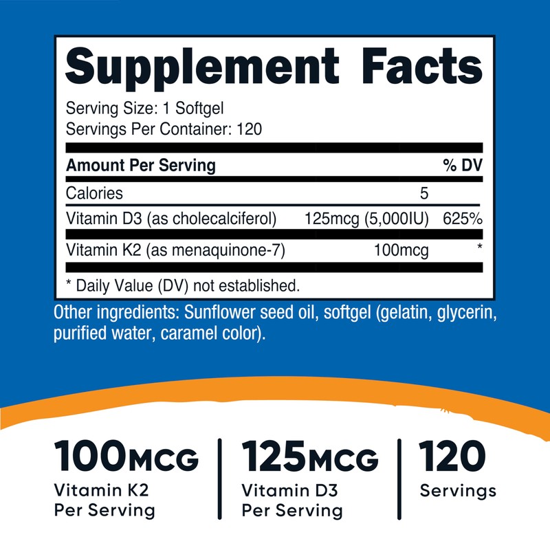 Nutricost Vitamin K2 (MK7) (100mcg) + Vitamin D3 (5000 IU) 120 Softgels - Gluten Free and Non-GMO