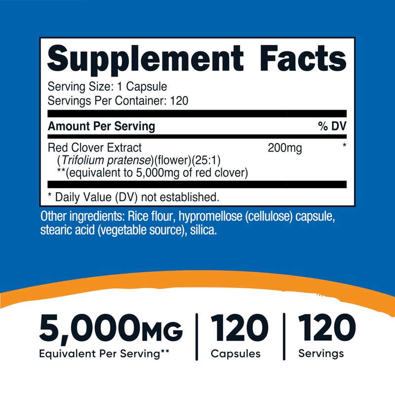 • Provides 200 mg of red clover extract at a 25:1 concentration—equivalent to 5,000 mg of red clover per serving
