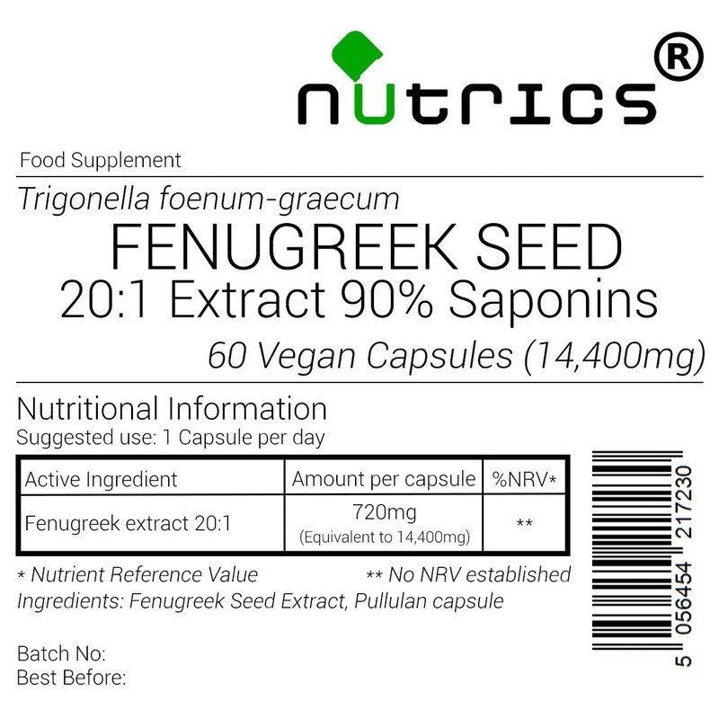 Nutrics® 14400mg Fenugreek Extract V Capsules- 20:1 90% Saponins Strong Extract- Suitable for Vegan Vegetarian Halal & Kosher Diet- 60 Capsules (2 Month Supply)