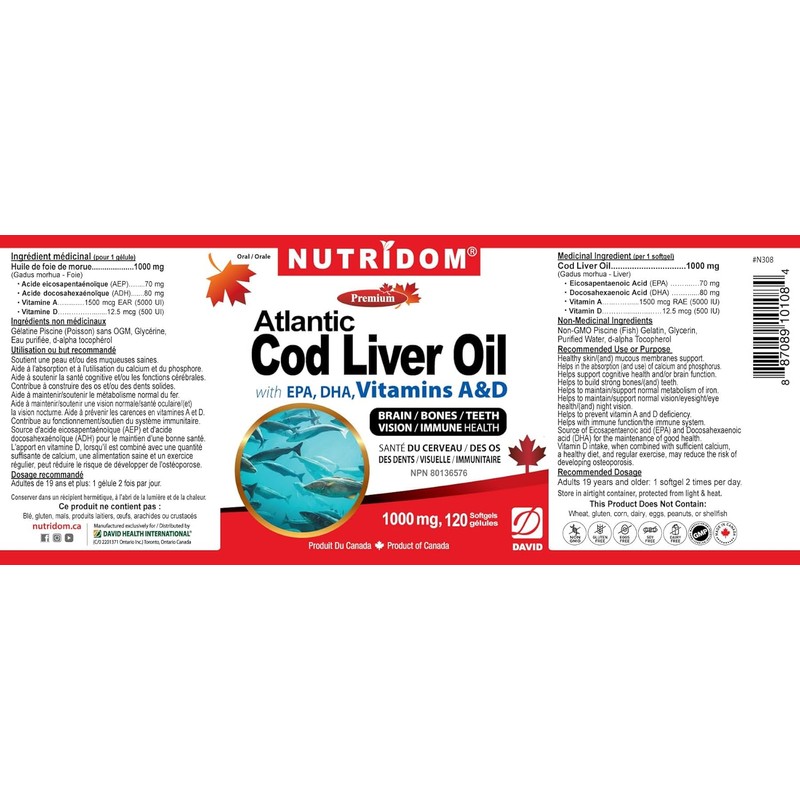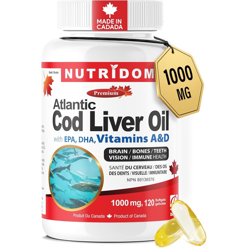NUTRIDOM Atlantic Cod Liver Oil 1000 mg – 120 Fish Gelatin Softgels – Rich in EPA, DHA, Vitamins A & D – Non-GMO, Gluten-Free, Made in Canada