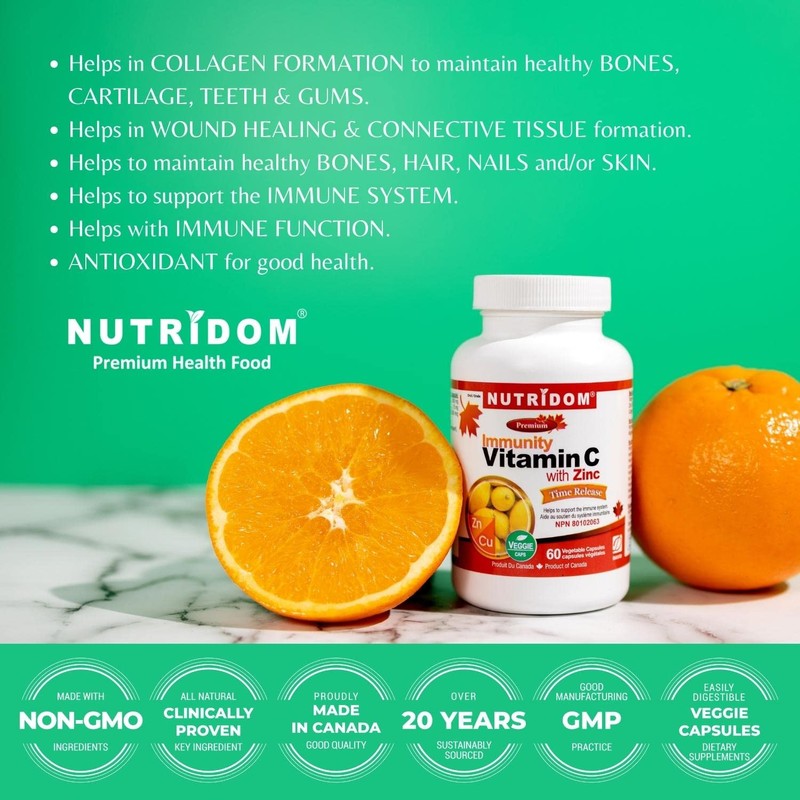 Nutridom Timed-Release Vitamin C (850 mg) with Zinc Bisglycinate (15 mg) and Copper Bisglycinate (1000 mcg) | Non-GMO, Free of Gluten, Soy & Dairy (60 Vegetable Capsules)