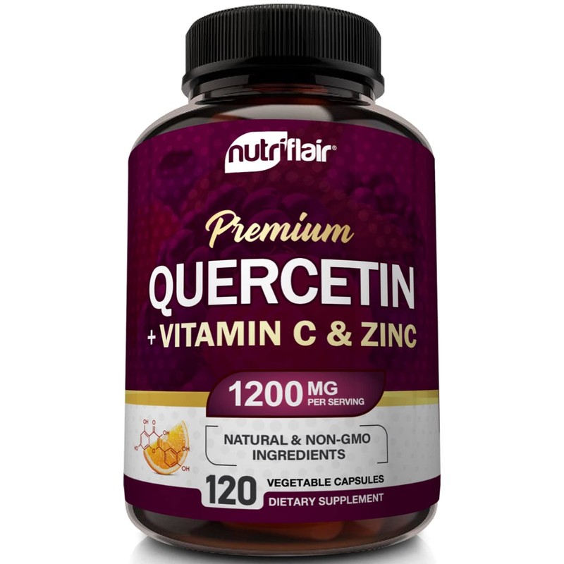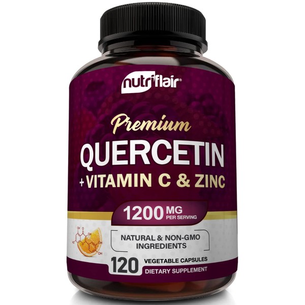 - Top Quality, Vegan, Non-GMO, Gluten-Free - Our professionally formulated natural quercetin supplements, are 100% natural, vegan, & gluten free. Our capsules contain NO fillers, soy, preservatives, binders, chemicals. Quercetin is often combined with immune supporting ingredients such as vitamin c, zinc, vitamin d, bromelain, elderberry, echinacea. Don't settle for quercetin 500mg, 800mg, 1000mg, or Quercetin without Vitamin C or Zinc. NutriFlair Quercetin with zinc contains 1200mg per serving.