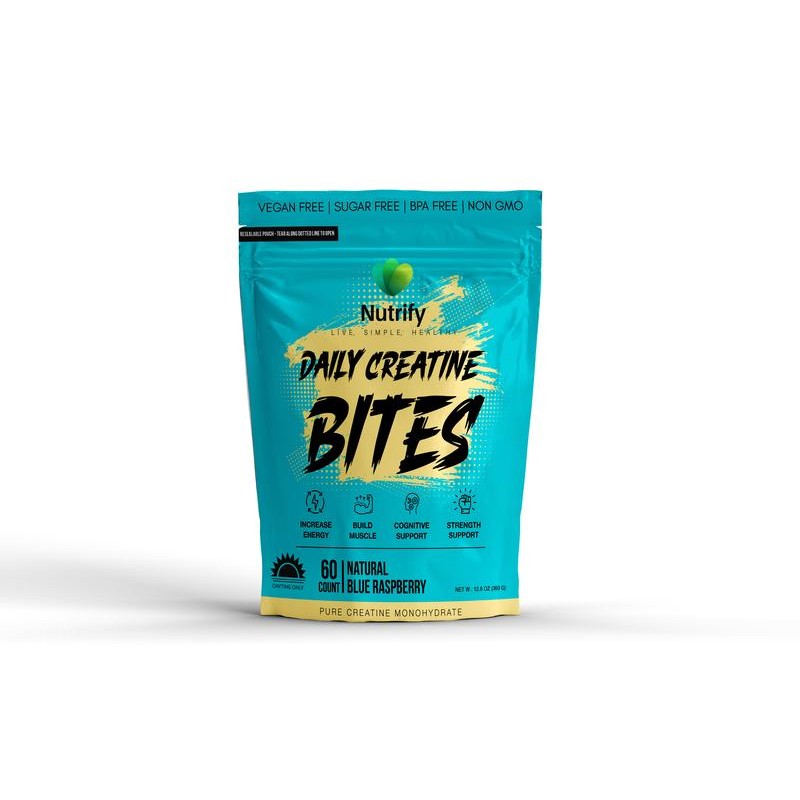 Enjoy a delicious, fitness-friendly treat with Nutrify Daily Creatine Bites. These vegan, sugar-free blue raspberry gummies combine flavor and function, delivering pure creatine monohydrate to support energy, muscle growth, and overall performance. Perfect for active adults and youth, each pack contains 60 natural count gummies for daily enjoyment. Crafted with natural ingredients and free from dairy, gluten, and artificial additives, these gummies make it easy to fuel your workouts, enhance cognitive and bone health, and support overall wellness—all while satisfying your sweet tooth.