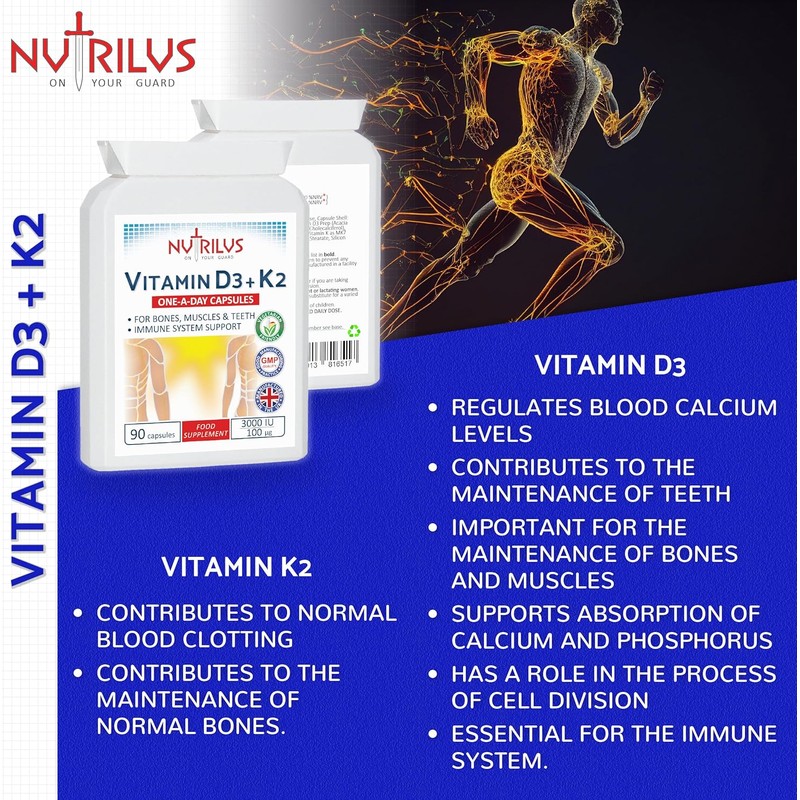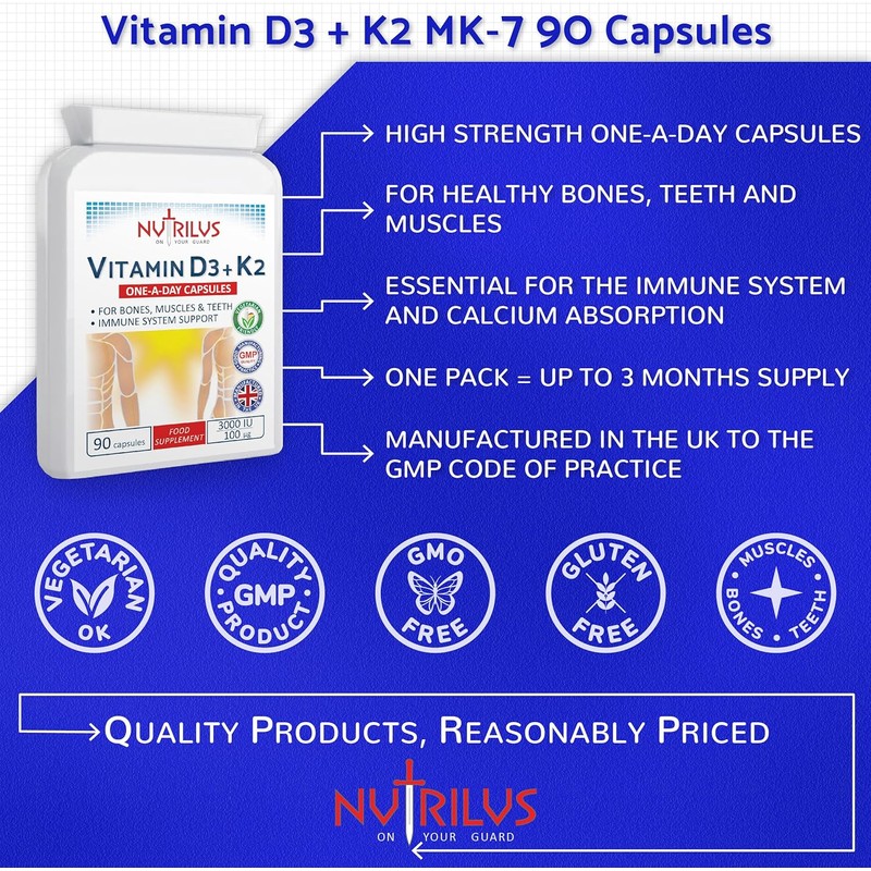 Nutrilus Vitamin D3 3000 IU and K2 MK-7 100mcg 90 Capsules - not Tablets - One Daily Supplement - Muscles - Bones - Teeth - Immune System