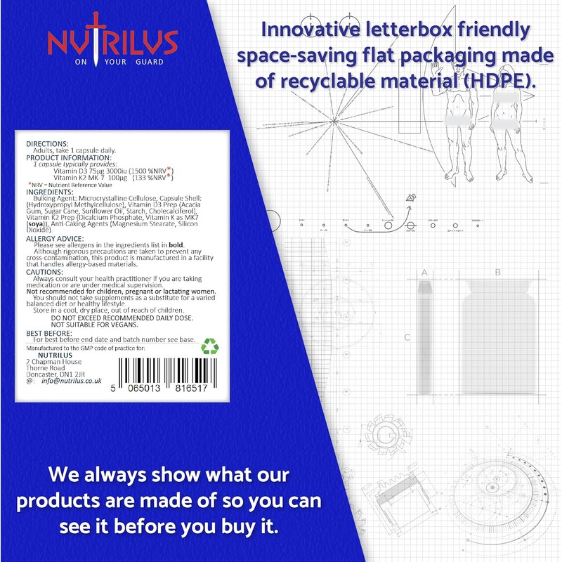 - Nutrilus Vitamin D3 + K2 capsules are packed in a flat, clever, letterbox-friendly tub that provides you with 3 months of supply of the supplement.