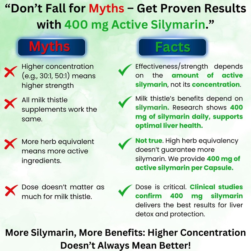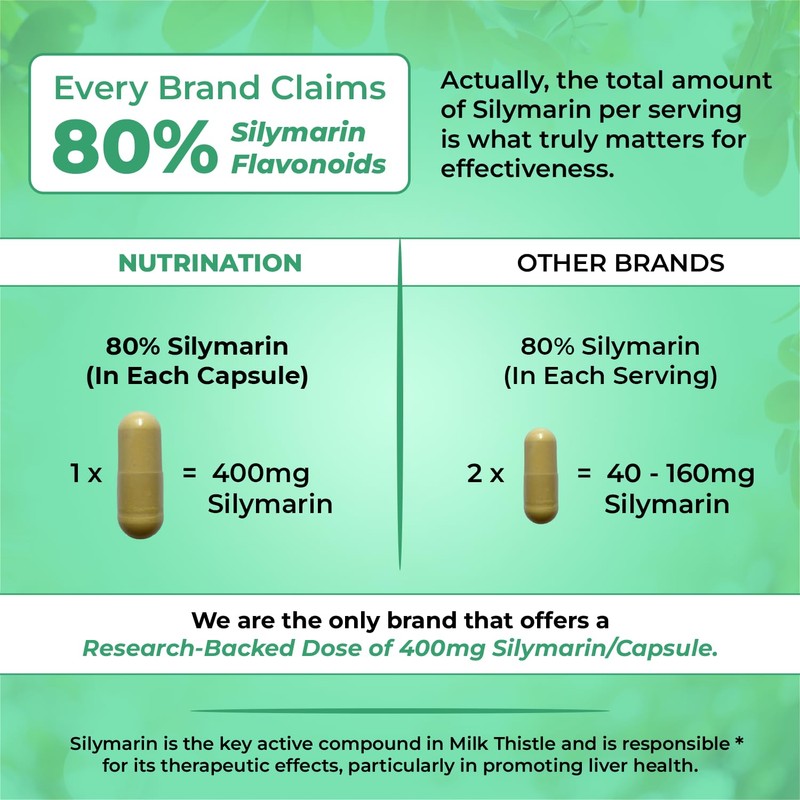- RESEARCH-BACKED POTENCY: Each capsule of our milk thistle herbal supplement provides 500mg of Milk Thistle Extract, standardized to 400mg of Silymarin per capsulethe ideal dose based on clinical research for liver health. Most brands offer only 40-100mg of Silymarin, which may fall short of the amounts shown to be effective. Our high-strength formula gives you a concentrated, therapeutic dose in one capsule!