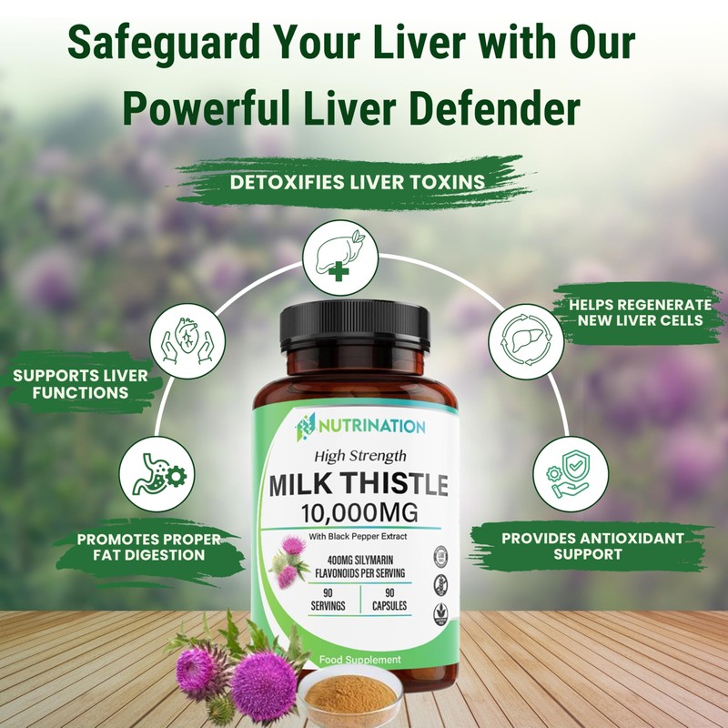 NUTRINATION Milk Thistle High Strength 10000mg | Market-Leading Silymarin 400mg per Capsule | 90-Day Supply | Milk Thistle Capsules (Not Tablets) with Black Pepper | Herbal Supplement for Liver Detox | Lab Tested