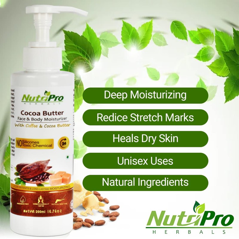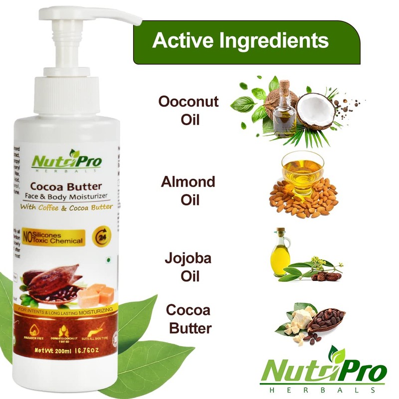 NutriPro Cocoa Butter Face & Body Moisturizer | With Cocoa Butter & Coffee | Non-Sticky Body Lotion for Women & Men| For Intense & Long Lasting |No Silicones Paraben Free (200ml)
