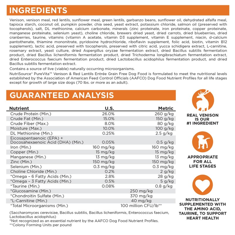 - As a member of our grain free series, NutriSource Pure Vita Venison and Red Lentils Dry Dog Food is formulated to meet AAFCO guidelines for all lifestages