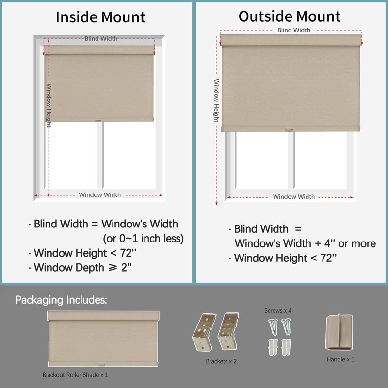 • 【How to Choose Right Size】Inside Mount: Your window frame depth should be greater than 2‘’, window height can be satisfied within 72‘’, cordless roller shade width you can choose window width -0.25‘’. Outside mount: You need to choose window width + 4‘’ and window length + 4‘’ for roller shades.