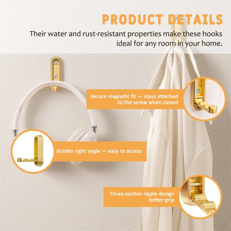 - Durable Gold Finish with Modern Touch: Crafted from sturdy zinc alloy with a sleek brushed gold finish, each hook supports up to 25 kg (57 lbs) — ideal for coats, towels, backpacks, and more.