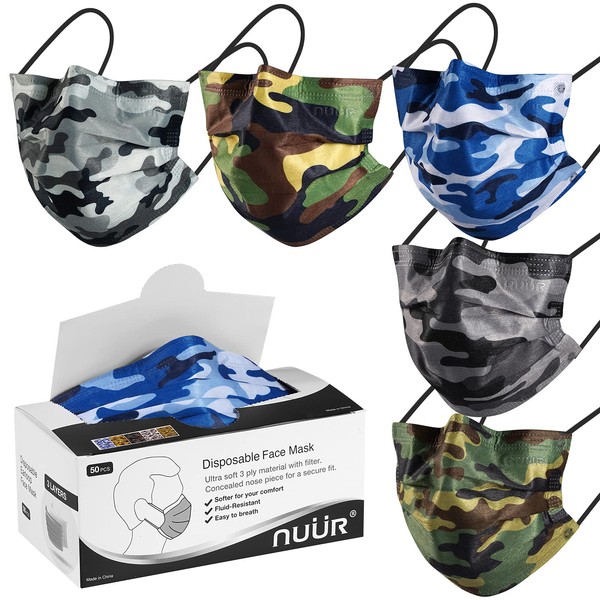 NUÜR 50pcs Camouflage 3 Ply Disposable Face Mask, Mask with Filter Layer and Elastic Earloop, Retail 50pcs/box